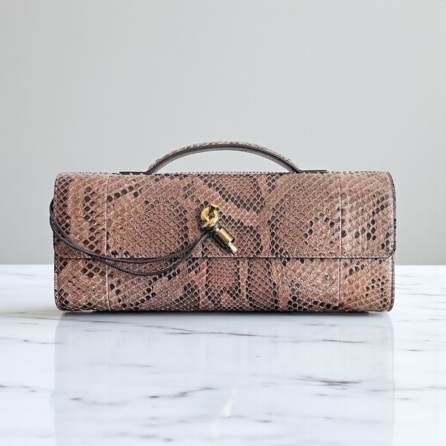 Materials Top handle clutch in python leather with signature knot closure Size 13 x 30 x 3 cm Colour Python/Fondant Note: Brand Box is slightly damaged.