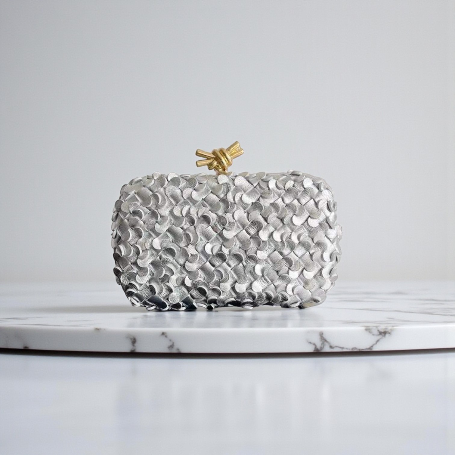 Materials Intreccio laminated lambskin, leather sequin detailing, metallic knot clasp closure Size 11.5 x 19 x 5 cm Colour Gold Note: Brand Box is slightly damaged.