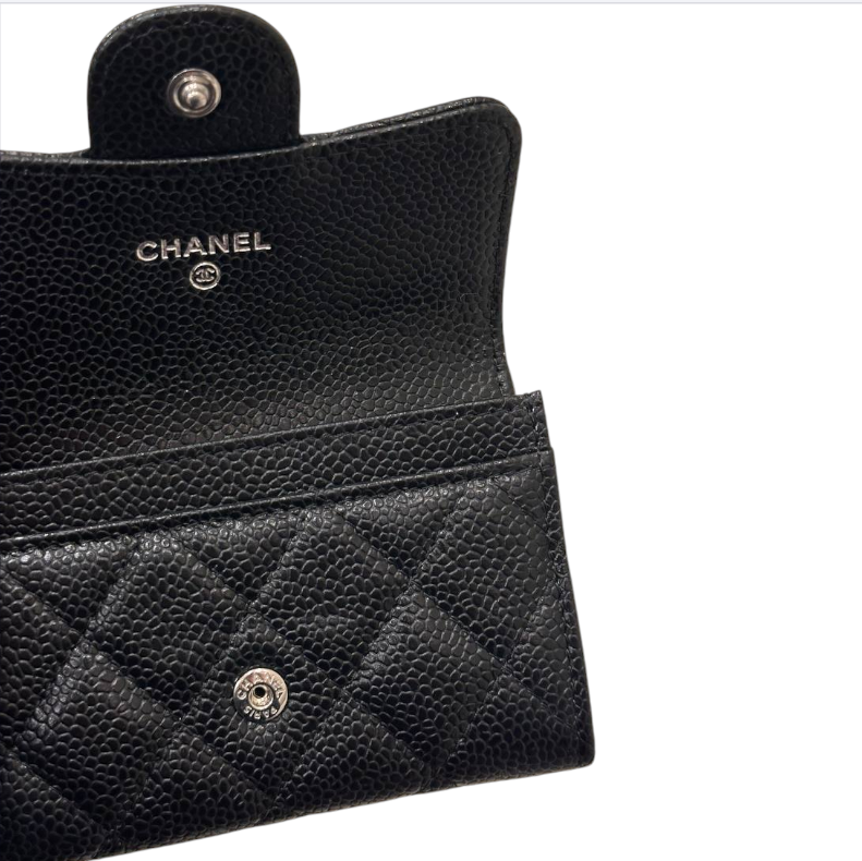 Materials Black Caviar Quilted Hardware Silver Hardware Size 11 x 8 x 1 cm Note: Box is slightly damaged.