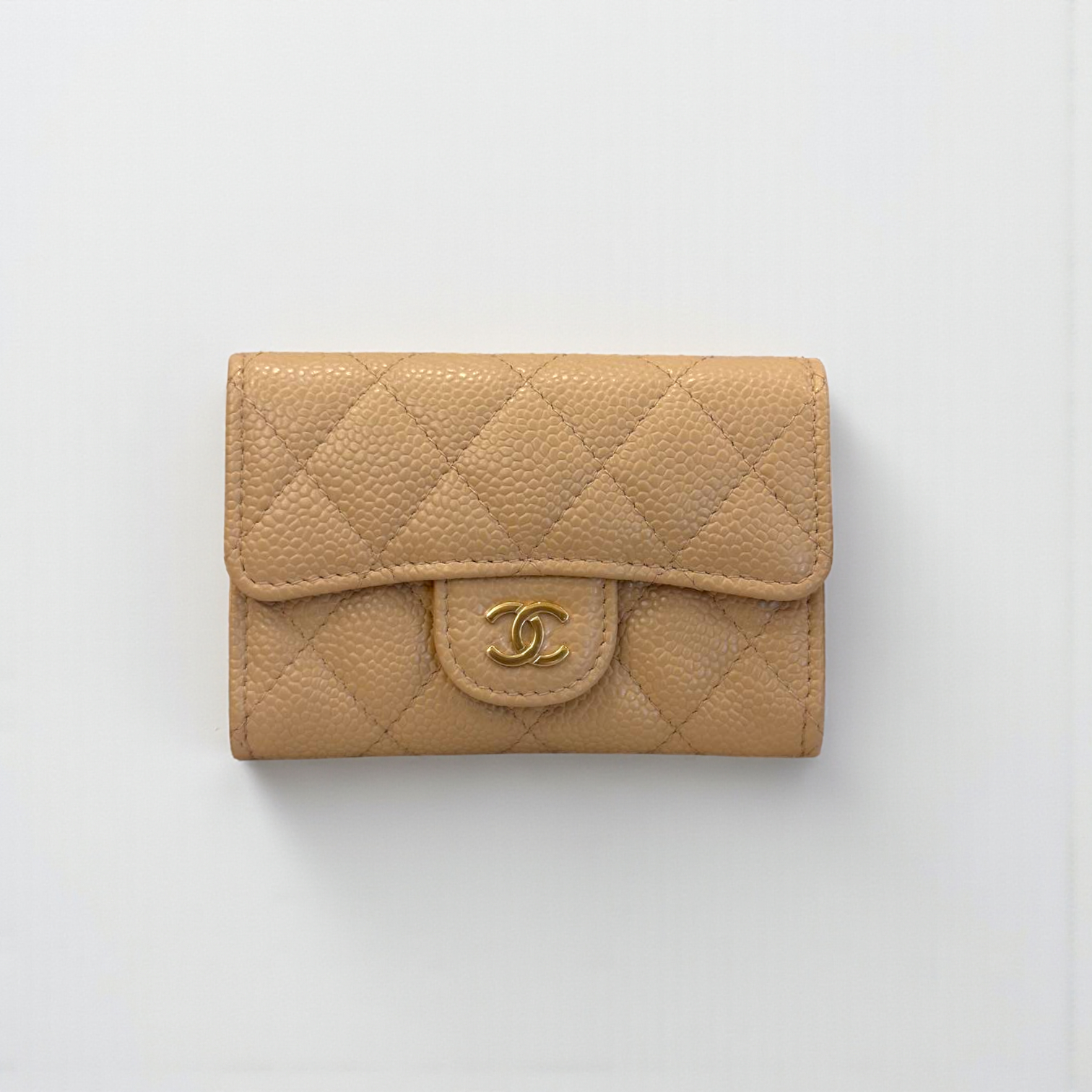 Materials Beige Caviar Quilted Hardware Light Gold Hardware Size 11 x 8 x 1 cm Note: Box is slightly damaged.