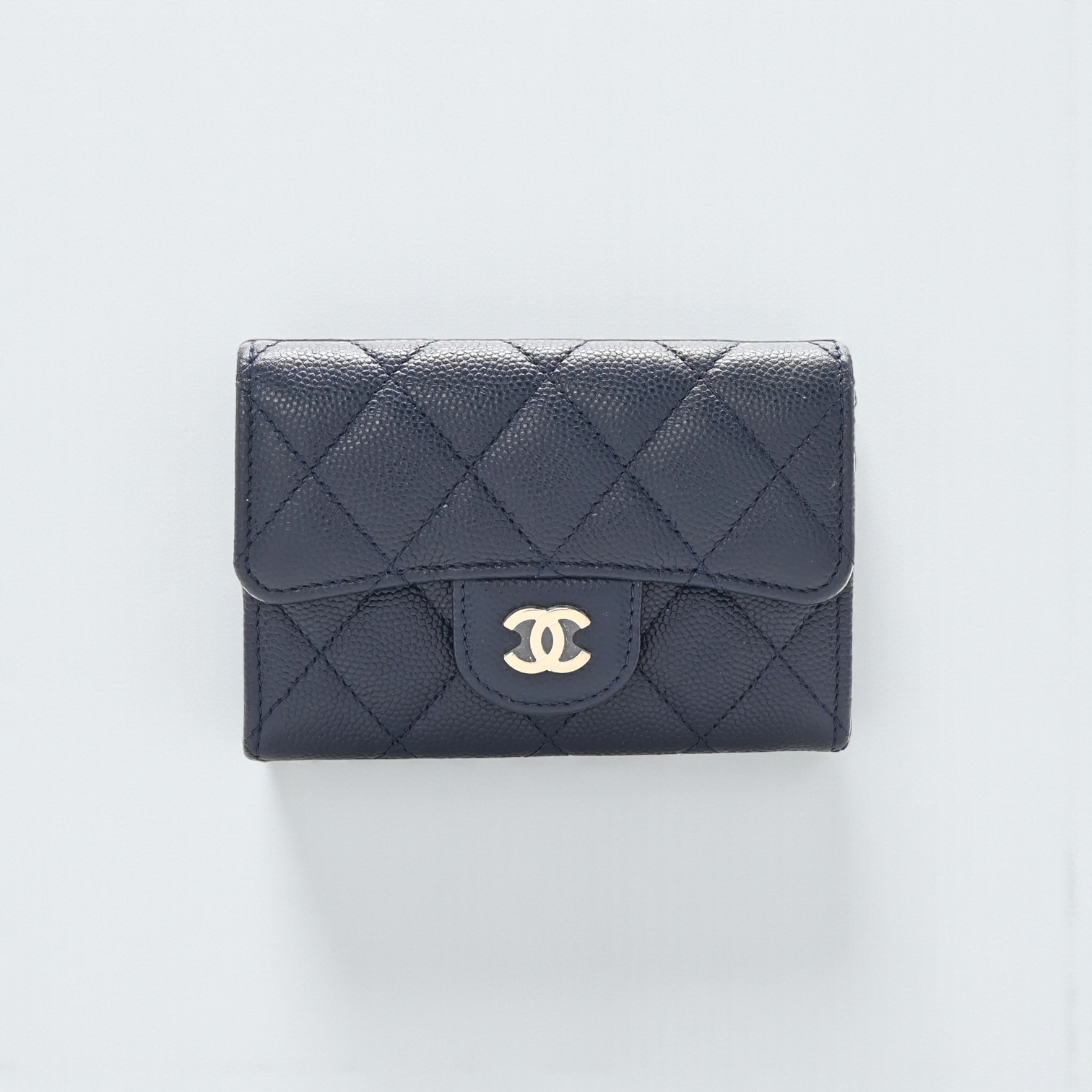 Materials Navy Blue Caviar Quilted Hardware Light Gold Hardware Size 11 x 8 x 1 cm Note: Box is slightly damaged.