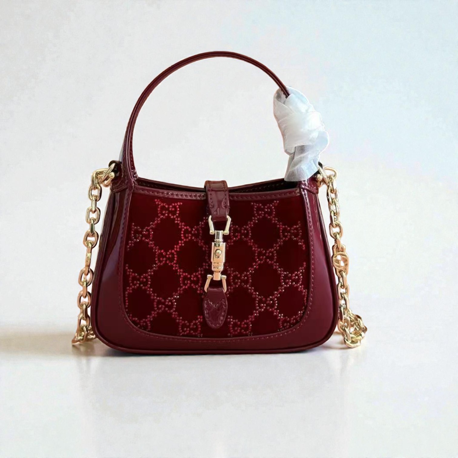 Materials Crafted in velvet and GG crystal motif Size 19 cm Note: Brand Box is slightly damaged.