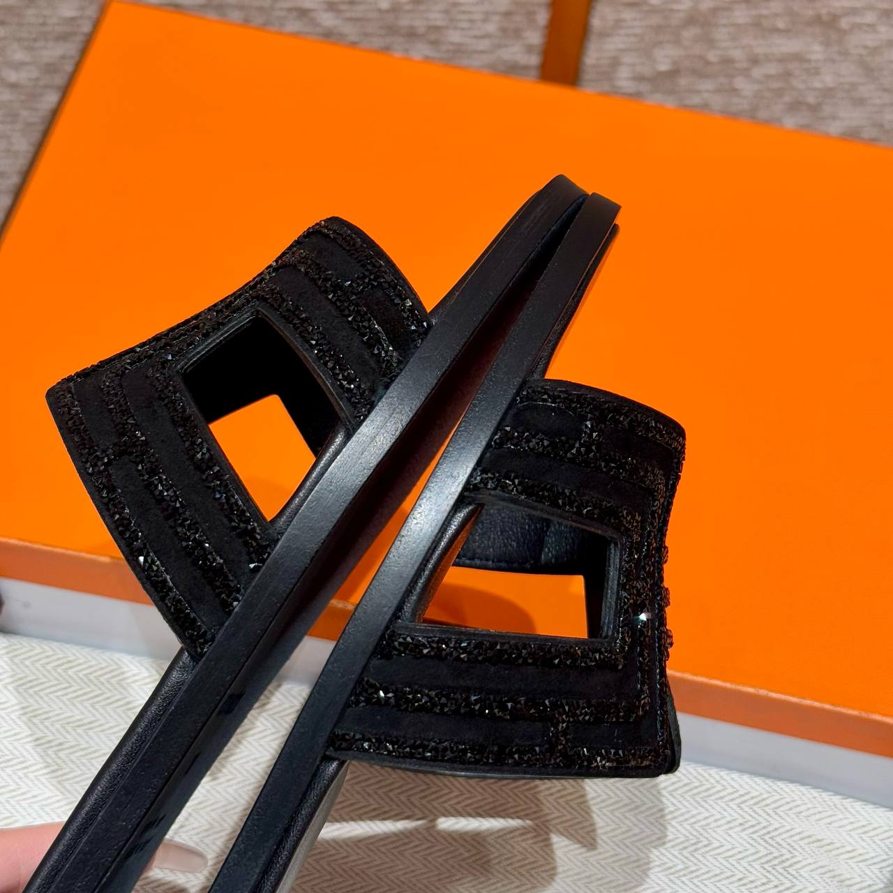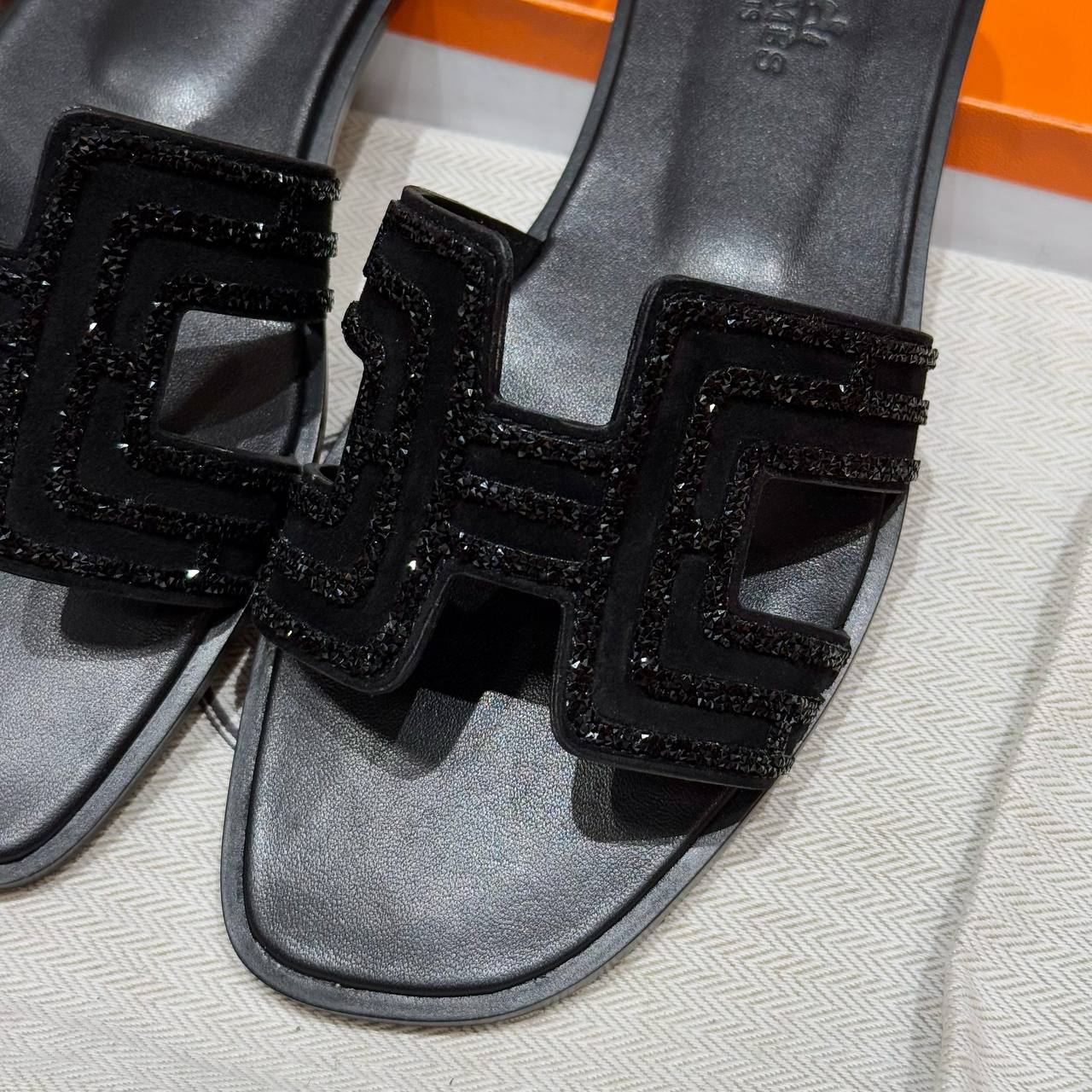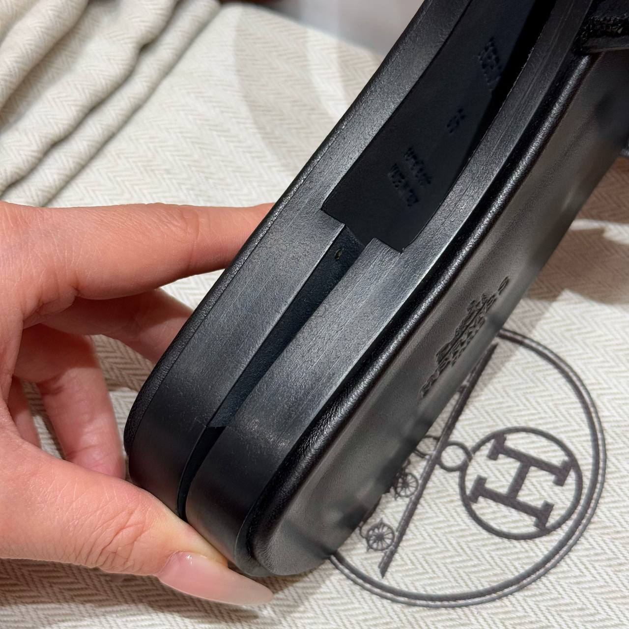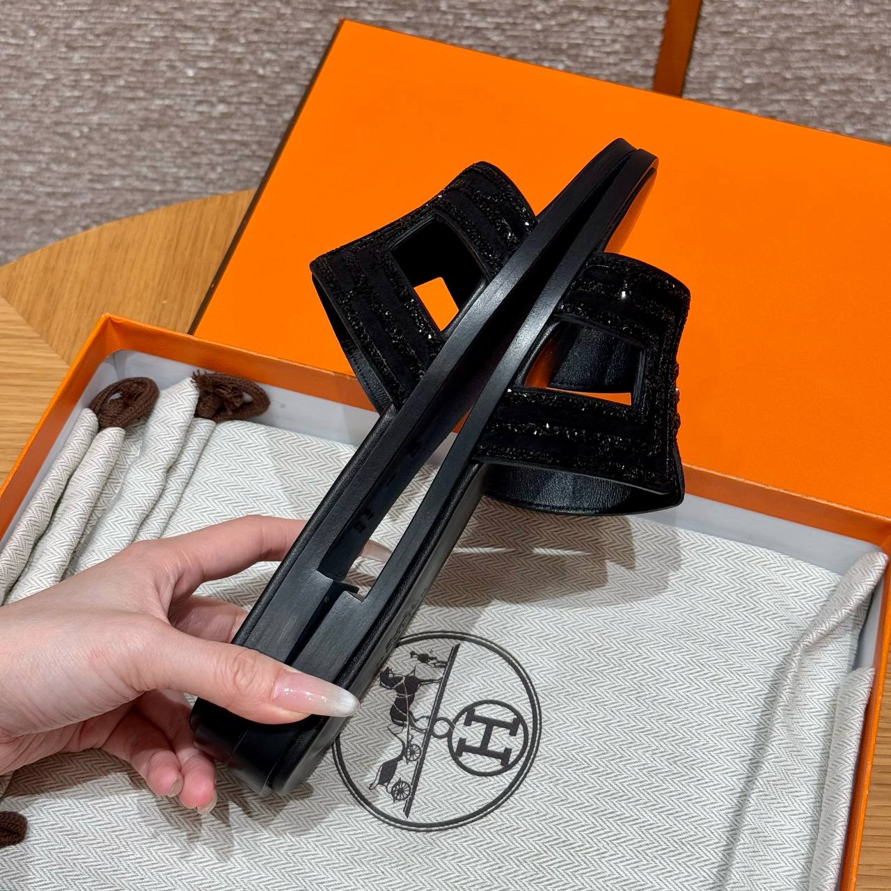 Hermes Oran Sandal in Noir, Chamois Leather